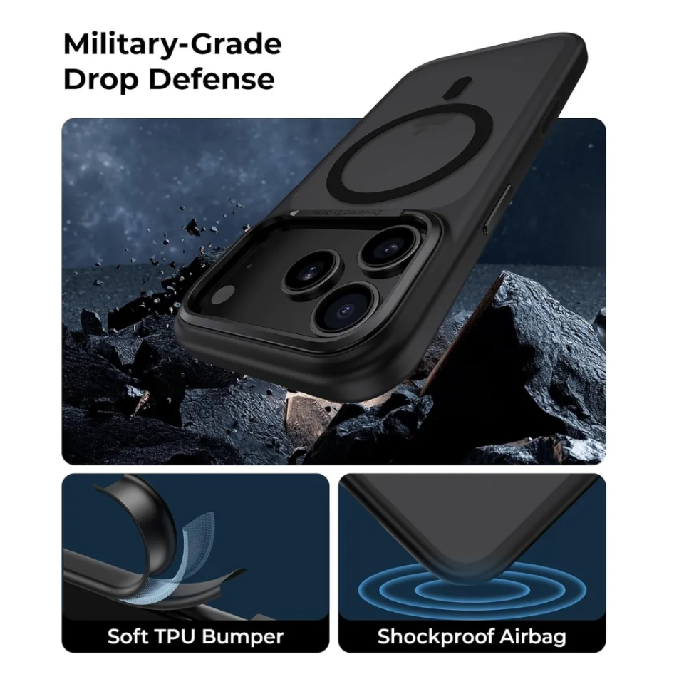 Protección contra caídas de grado militar: diseñado para sobrevivir a caídas de hasta 6 pies. Reforzado con bolsas de aire 3D en forma de anillo en las cuatro esquinas, además de un borde de TPU envolvente completo que amortigua cada impacto. Los bordes elevados alrededor de la parte posterior y los laterales ayudan a tu iPhone a mantenerse a salvo de golpes diarios, resbalones y caídas accidentales.
